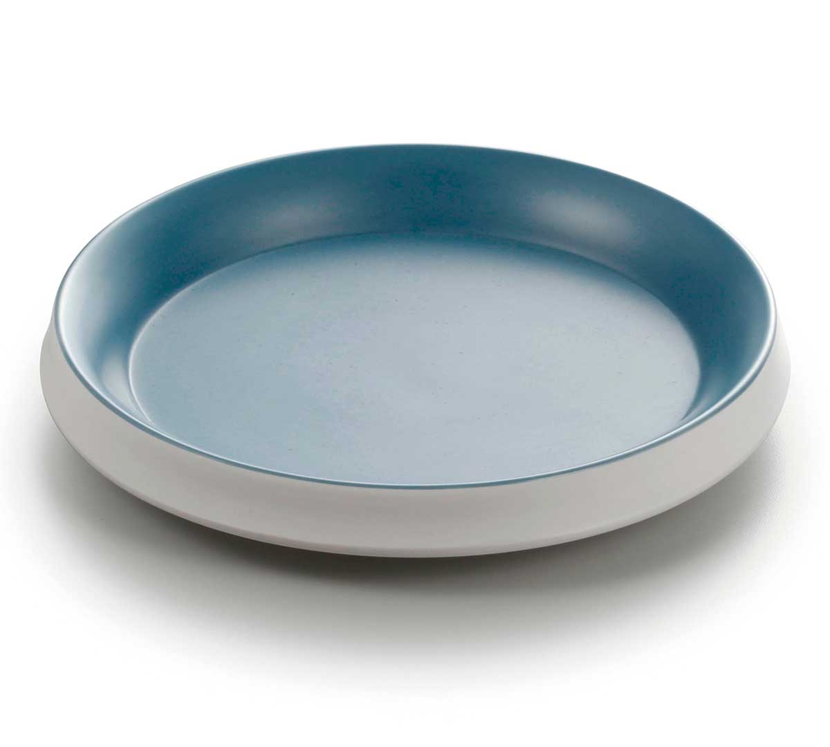 La parte superior de la vajilla es de color azul y la parte inferior de color blanco.