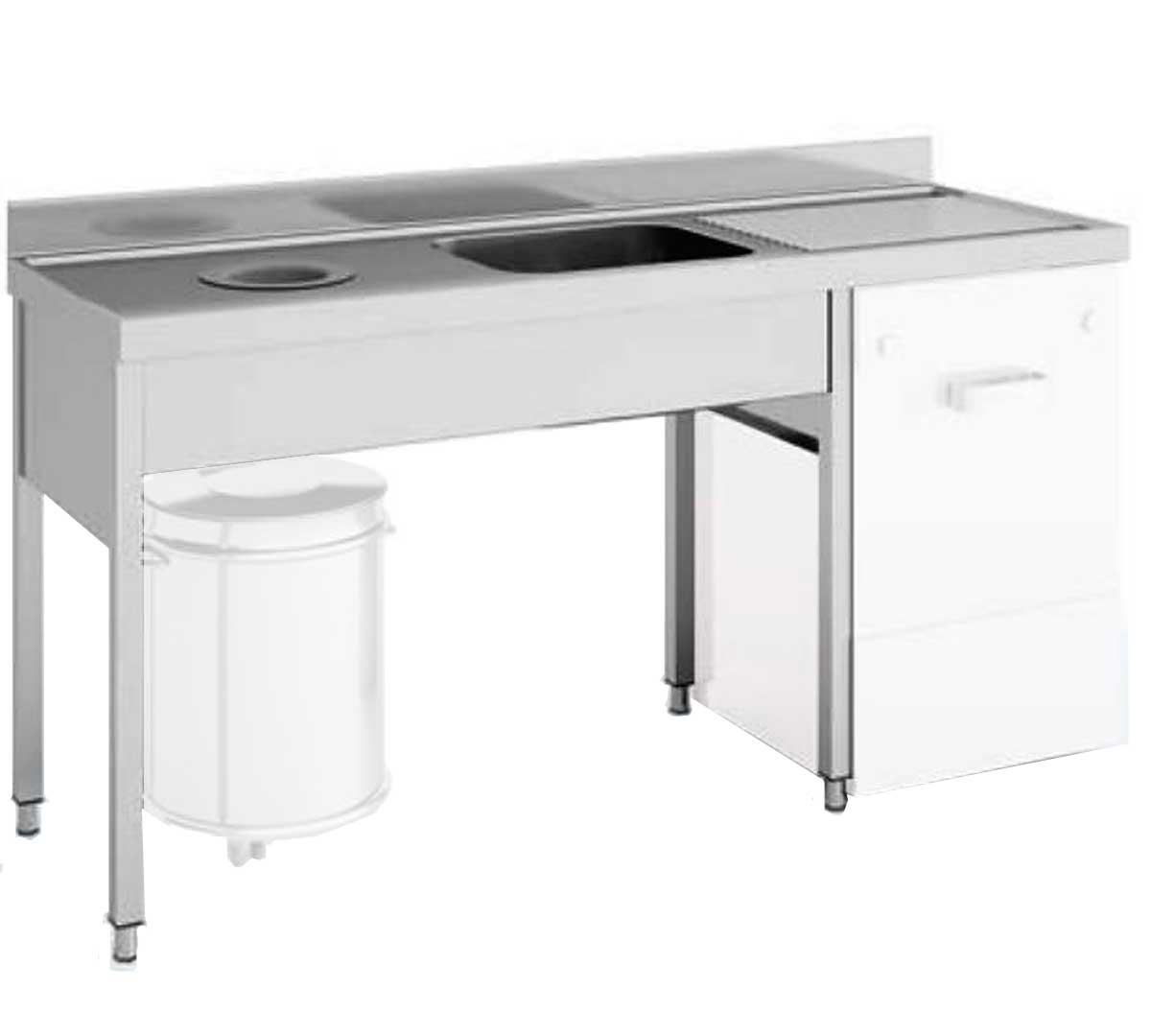Mesa de lavado con cubeta embutida y agujero de desbarace. Diseñado para alojar un cubo de desperdicios debajo de la encimera. Incluye bastidor con espacio para lavavajillas. Está disponible con escurridor a izquierda o derecha.
