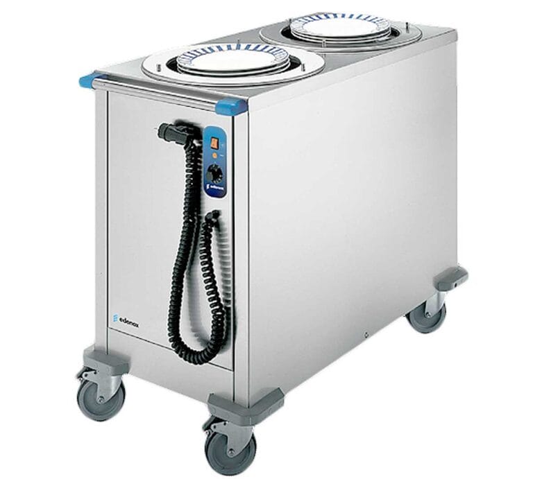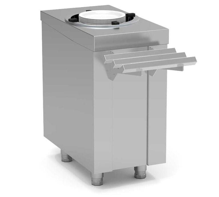 Armario calienta platos fabricado en acero inoxidable. Tiene un estante intermedio ajustable y una puerta. Para platos con un diámetro máximo de 32 cm. El rango de temperatura es de 30 a 85 ºC.