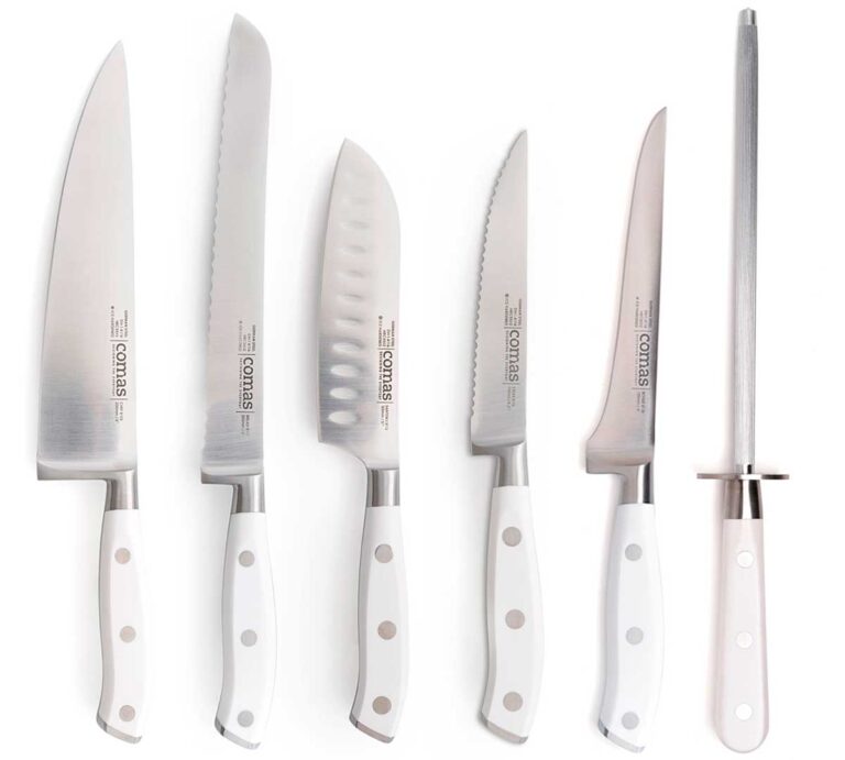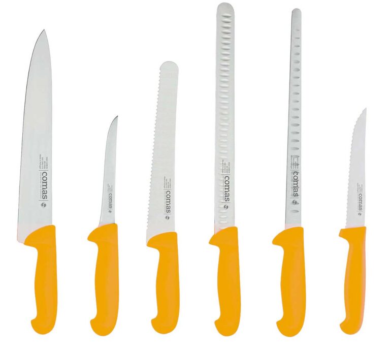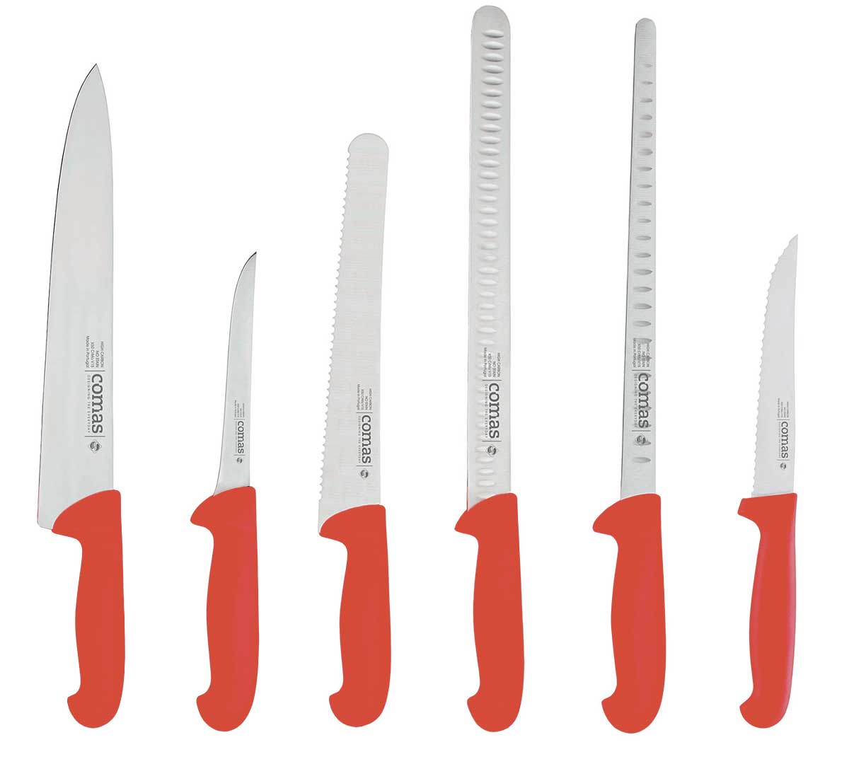 El Cuchillo Serie Carbón Rojo de Comas está disponible en 10 modelos con el mango en color rojo indicado para el corte de carne cruda. El color permite identificarlo fácilmente y garantizar la seguridad alimentaria en la preparación de los alimentos.