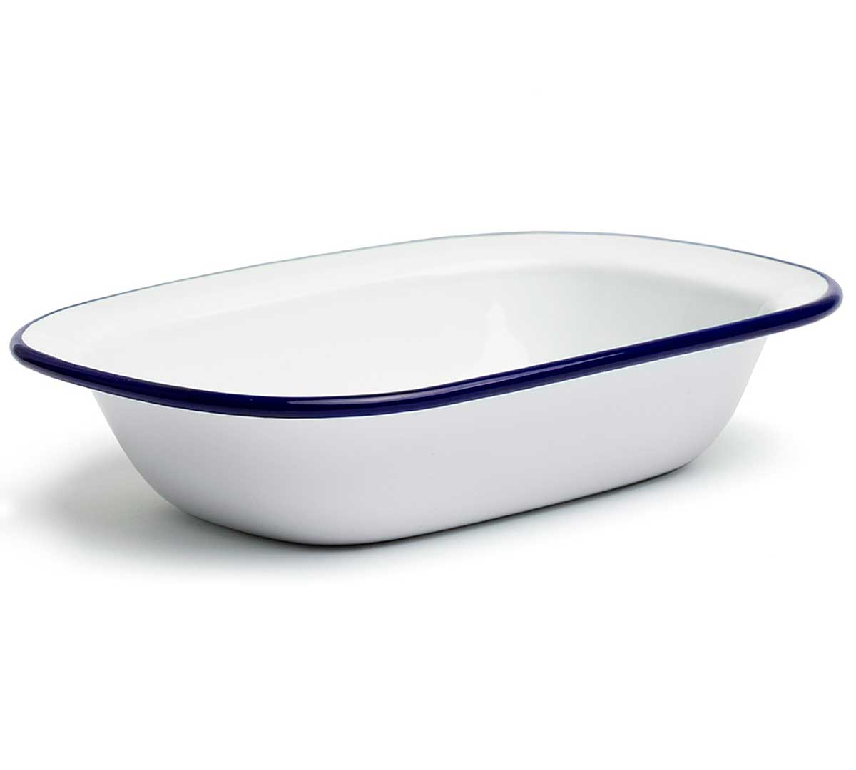 Está fabricado en hierro esmaltado en color blanco con borde azul.