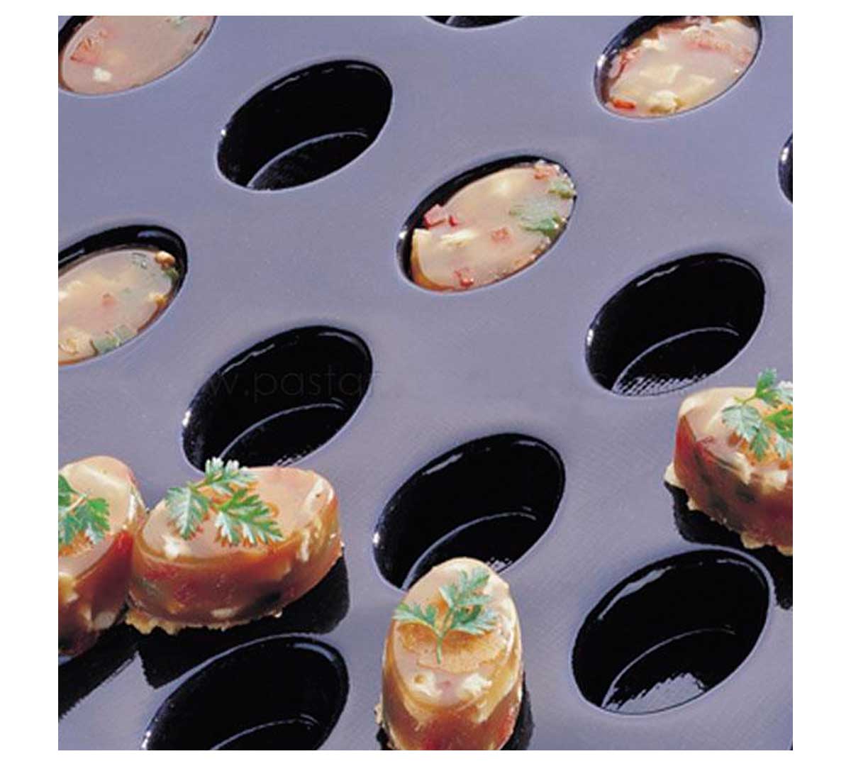 El Molde Flexipan Óvalos de Pujadas no requiere ser engrasado ya que su composición y flexibilidad permiten un desmolde fácil y rápido. El flexipan es una combinación de fibras de vidrio y silicona adecuadas para el uso alimentario.