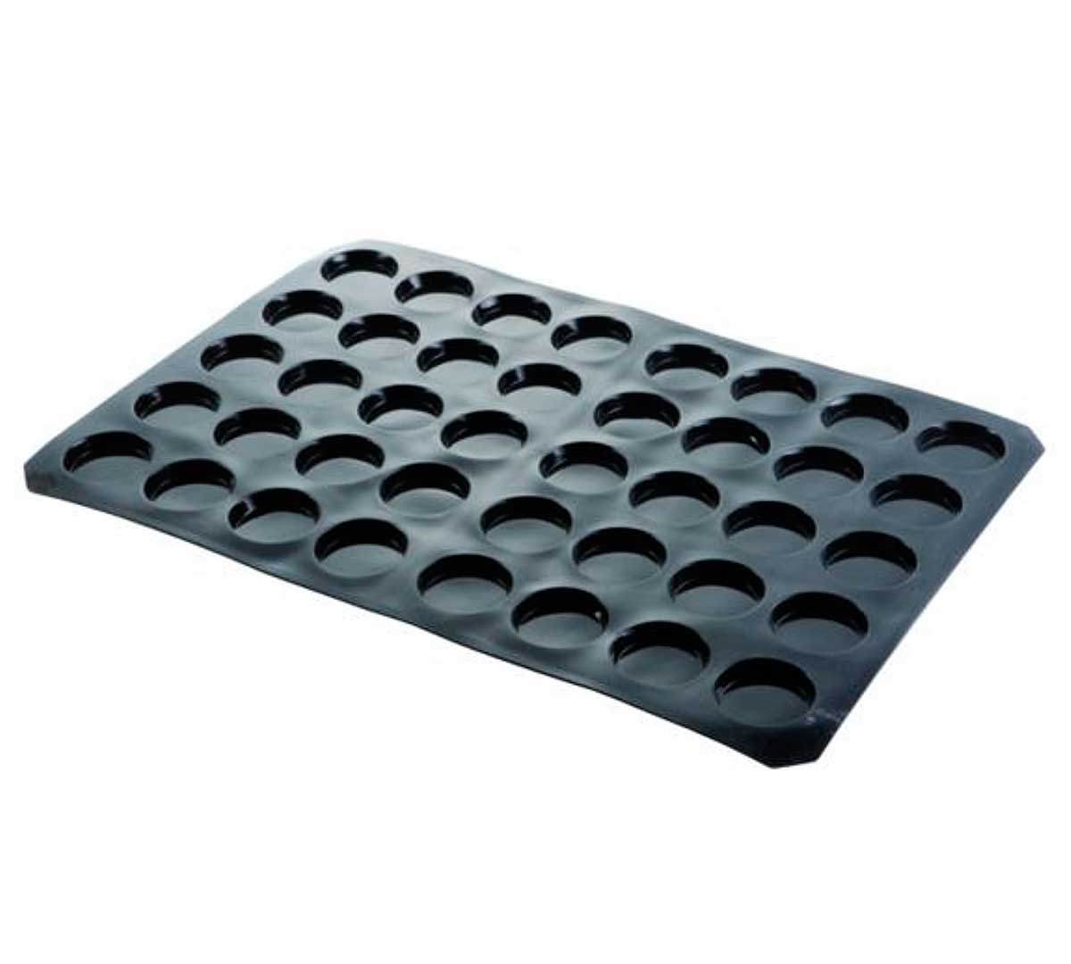 Molde fabricado en silicona diseñado para elaborar 40 pasteles con forma de florentina de Ø 5,5 cm y alto 1,2 cm. El molde en su totalidad tiene unas medidas de 60 x 40 cm y puede dividirse en 2 moldes de 30 x 20 cm gracias a su diseño simétrico. Permite un rápido y fácil desmolde gracias a su flexibilidad. Ideal para congelador, horno y lavavajillas. Resistente a temperaturas de -60 a 230 ºC.