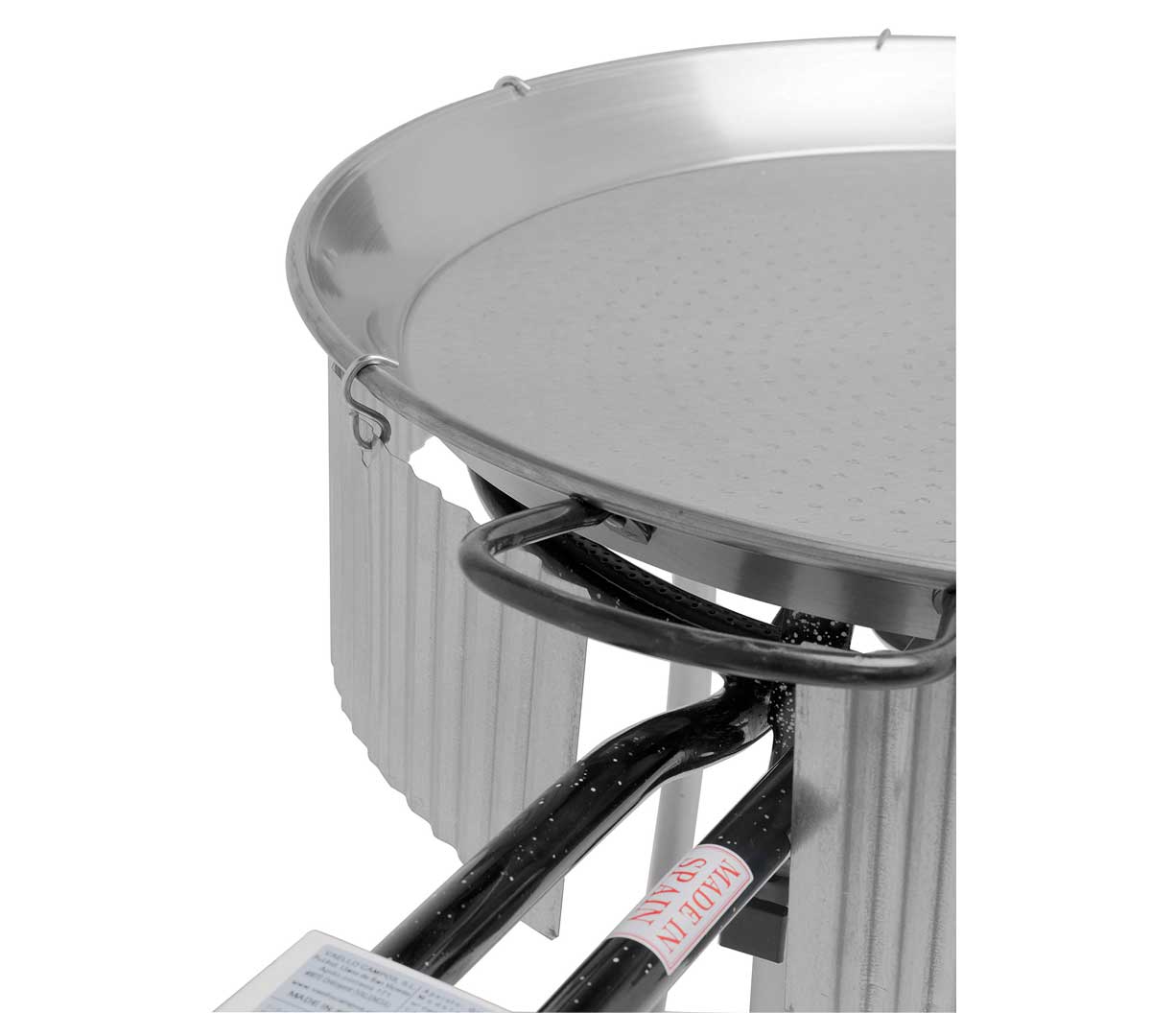 Incluye unos ganchos para colocar las piezas en el borde de la paellera.