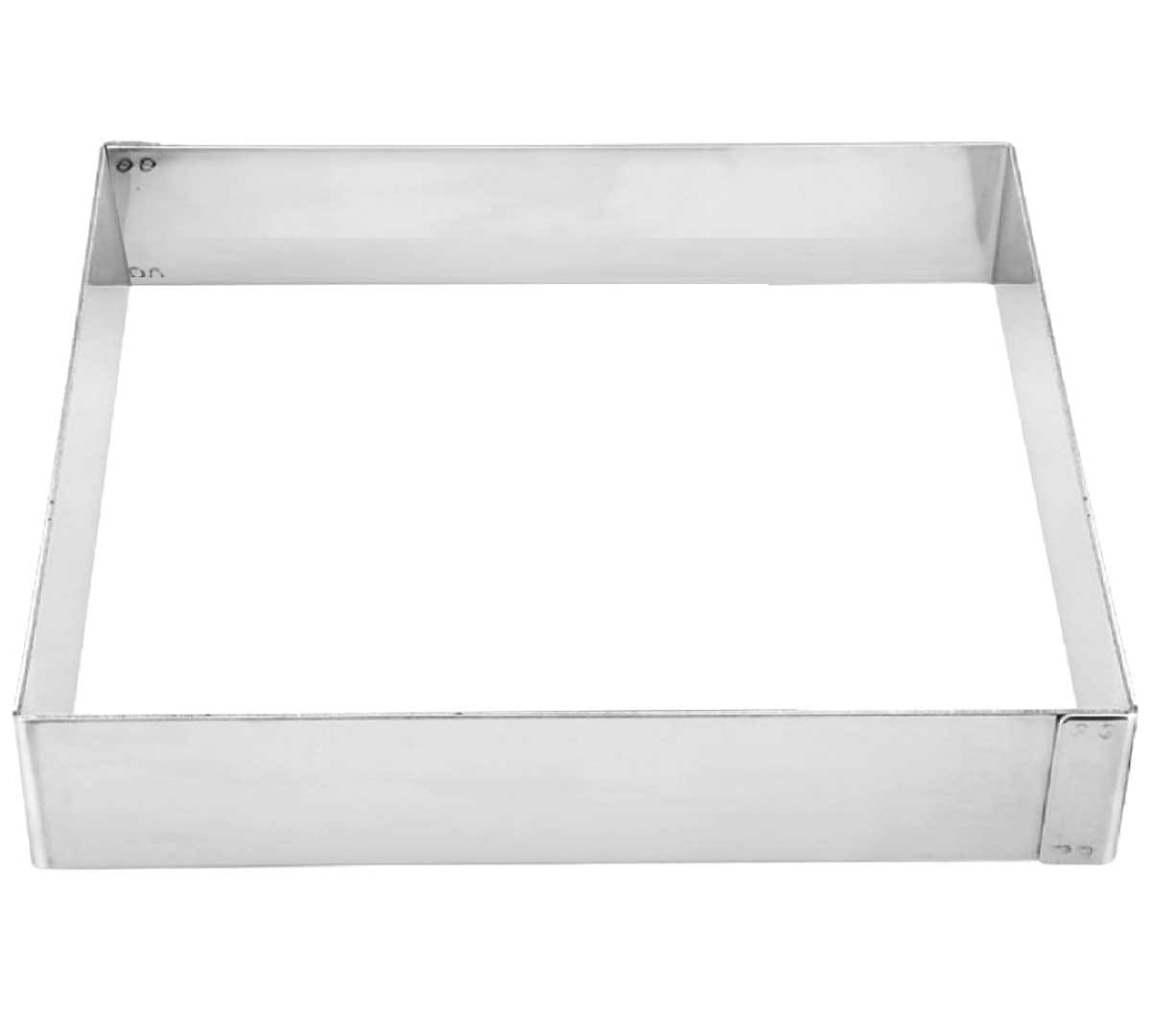 Molde cuadrado fabricado en acero inoxidable 18/10. Está disponible en 5 tamaños con unas medidas de 6 x 6 a 20 x 20 cm y un alto de 4 cm. El acero inoxidable es un material que permite un mayor higiene y gran durabilidad.