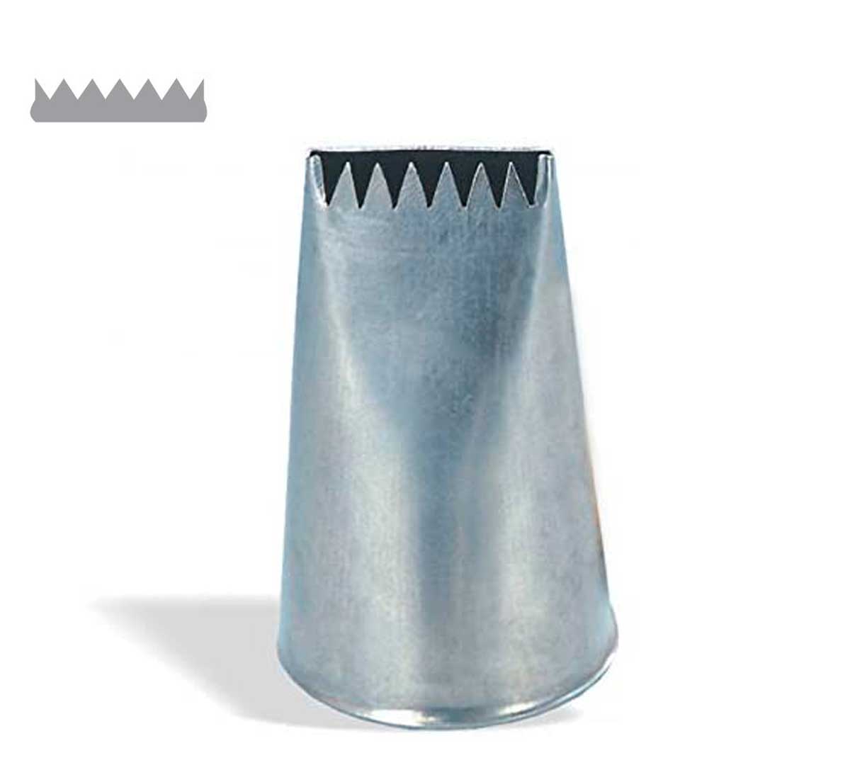 Boquilla de acero inoxidable disponible en 2 modelos con 6 puntas y diferentes tamaños. Este modelo permite realizar diseños con forma de cinta estrella. Es apta para todas las mangas pasteleras de Pujadas.