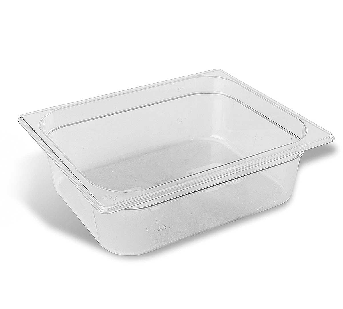 Cubeta Gastronorm 1/2 de policarbonato. Ideal para almacenaje y presentación de productos fríos en buffets. La capacidad oscila entre 4 y 11,20 litros, según el modelo.