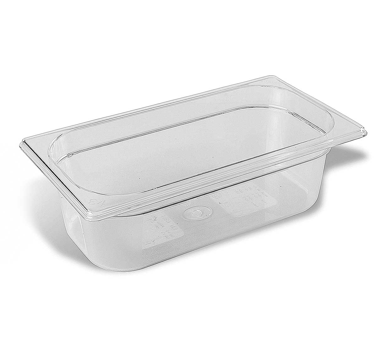 Cubeta Gastronorm 1/3 de policarbonato. Ideal para almacenaje y presentación de productos fríos en buffets. La capacidad oscila entre 2,35 y 6,35 litros, según el modelo.