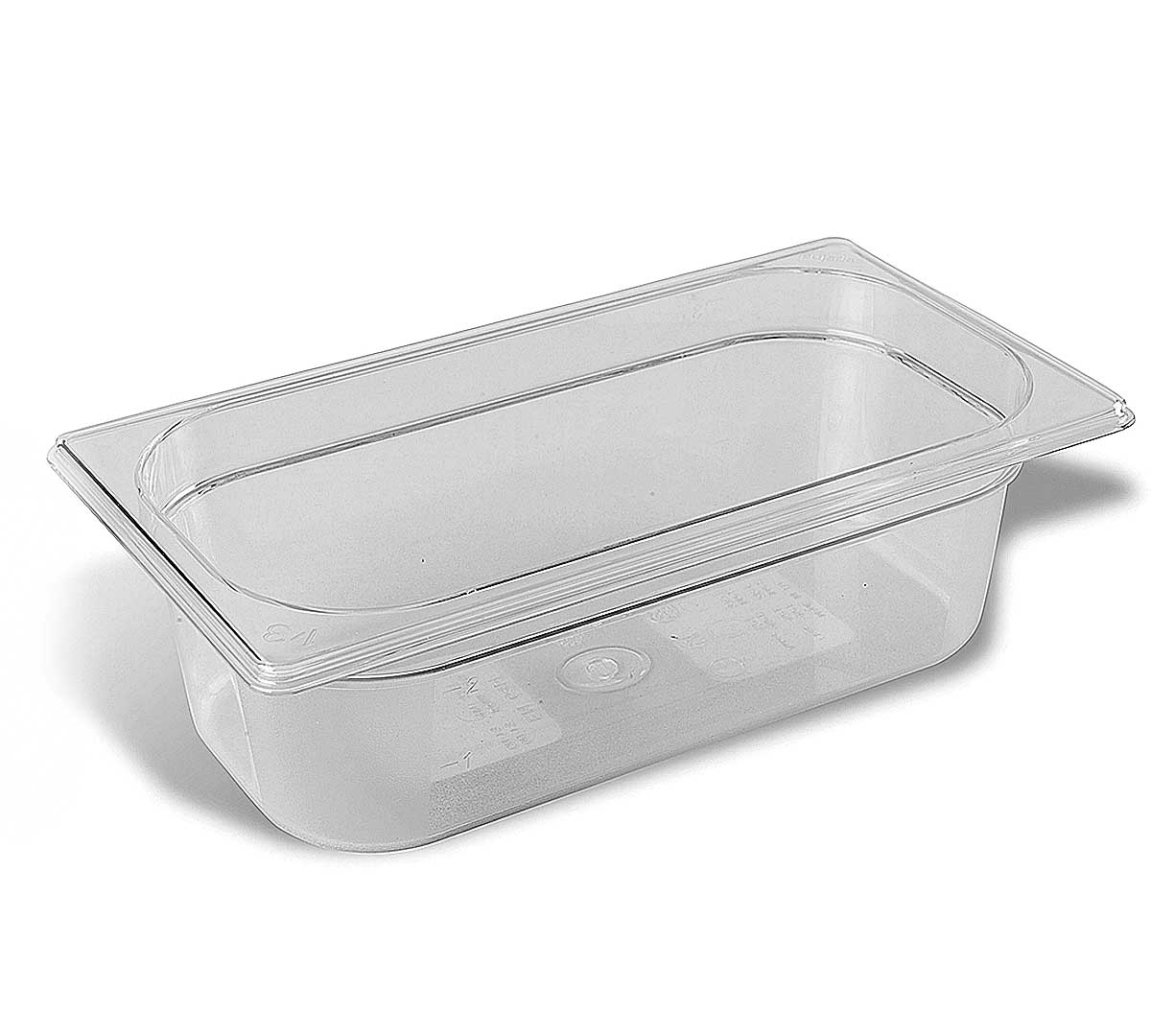 Bandeja Gastronorm 1/3 de copoliester sin Bisfenol-A. Un material alternativo al policarbonato. Es transparente y resistente a los impactos. Está disponible en modelos con diferente altura, desde 6,5 hasta 20 cm. Ideal para almacenaje, es apilable.