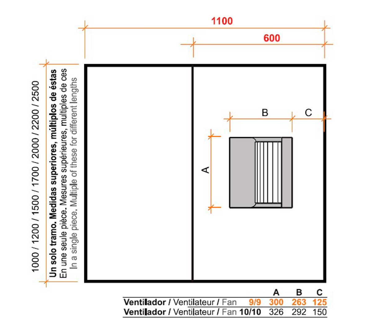 Existan anchos con dimensiones superiores a 250 cm ya que el caudal de extracción necesario exigiría un ventilador muy grande que no entraría en el interior de la campana.