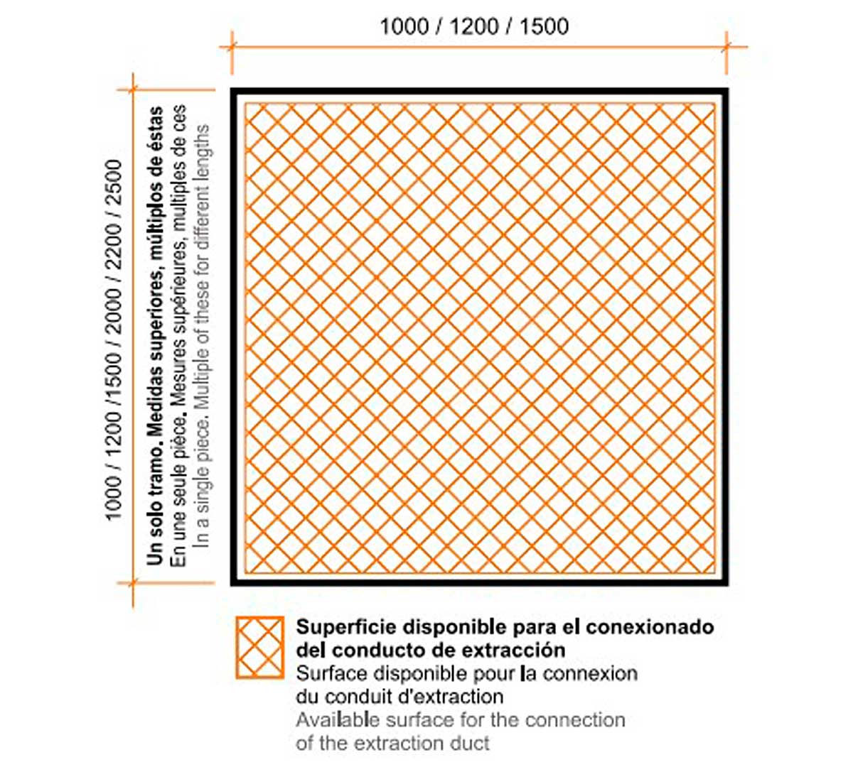 Está completamente fabricada en acero inoxidable, con envolvente de forma cúbica, tiene faldones rectos y puede ser utilizada tanto contra pared como central.